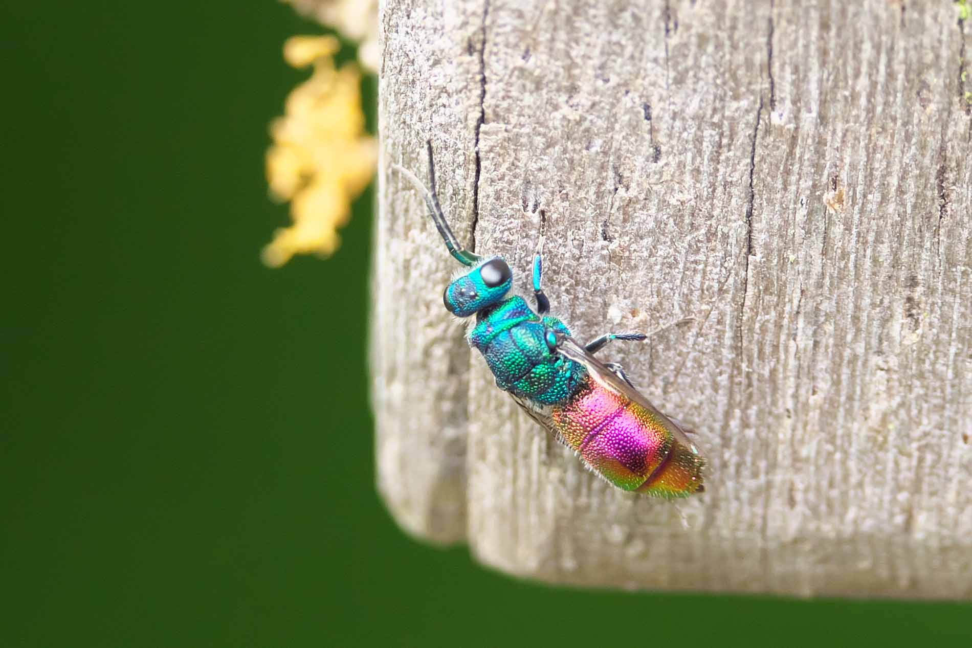 Besonders auffällig unter den Kuckuckswespen sind die farbenfrohen Goldwespen. Sie faszinieren mit ihrem prächtigen Metallglanz und ihrer roten, grünen oder violetten Färbung. Sie zählen zu den schönsten Insekten.
